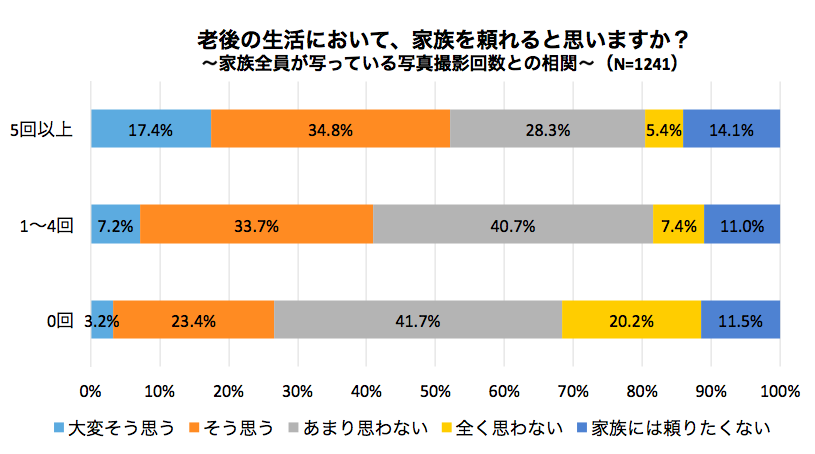 ※自分自身を含む全員が揃った家族写真の撮影回数を問う設問で、5回以上の撮影者は93名、1〜4回が555名、0回が593名(合計1,241名)の回答を元に、家族仲や老後の生活において家族を頼れると思うかの相関関係を調査しました。